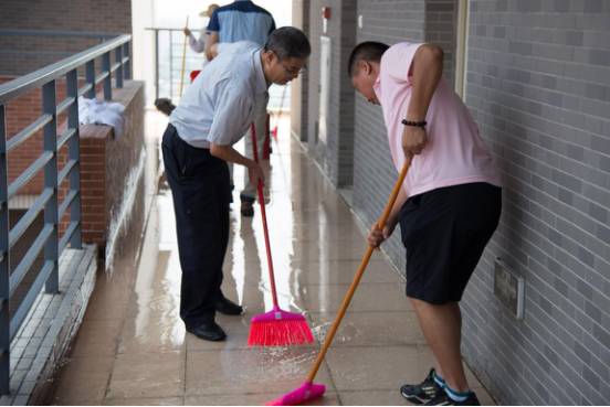 廖振亮副院长(左)与工作人员一起清洁学生公寓走廊