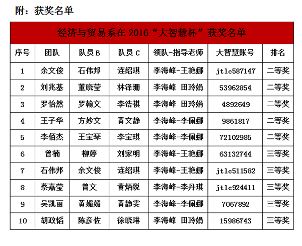 2016年3月,经贸系由李海峰老师领队,王艳娜、田玲娟、张玉春、徐永金、李佩娜、李丹琪6位老师组成指导教师团队,组织学生报名参加了由团中央学校部、全国学联秘书处联合举办的全国大学生第三届“大智慧杯”金融精英挑战赛,经过激烈角逐,最终取得优异成绩。经贸系共有10支队伍30名学生获奖,其中,余文俊、刘兆基、罗怡然、王子华、李佰杰等15名同学荣获二等奖,曾楠、石伟邦、蔡嘉莹、吴凯丽、胡政韬等15名同学荣获三等奖。