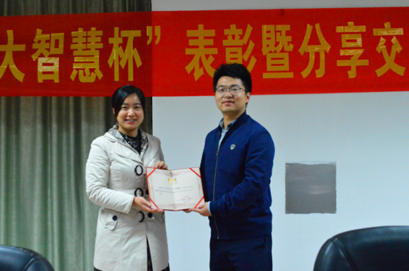 院团委副书记代亮为指导教师代表王艳娜老师颁发“大智慧杯”指导老师聘书