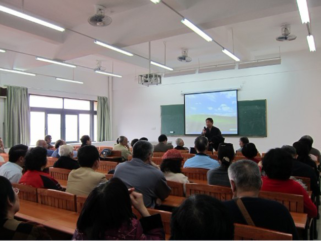 图1 刘美南书记在教学楼课室为离退休老领导讲解校区现状与发展前景