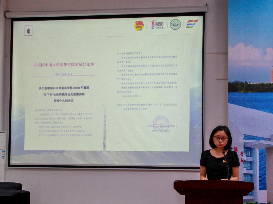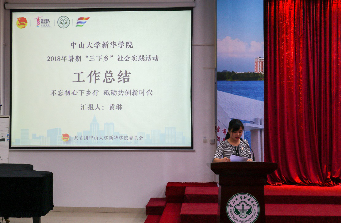 十三年的中大新华沉淀,六年的下乡历练。校团委副书记黄琳老师就组织情况、实践成效、社会影响、未来展望四方面向大会简要汇报了2018暑期“三下乡”社会实践活动的开展情况。