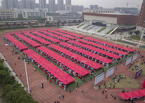 晋升迅速、周末双休、年薪丰厚、食宿补贴……510余家企业各使解数招纳人才,在中山大学新华学院(以下简称“中大新华”)上演了一场“抢人大战”。12月1日,中大新华2019届毕业生校园招聘会510余家企业参会提供5000余个岗位,招聘岗位涵盖了教育培训、行政人事、金融证券、新媒体等行业,吸引了校内外毕业生、当地民众5000余人进场求职。