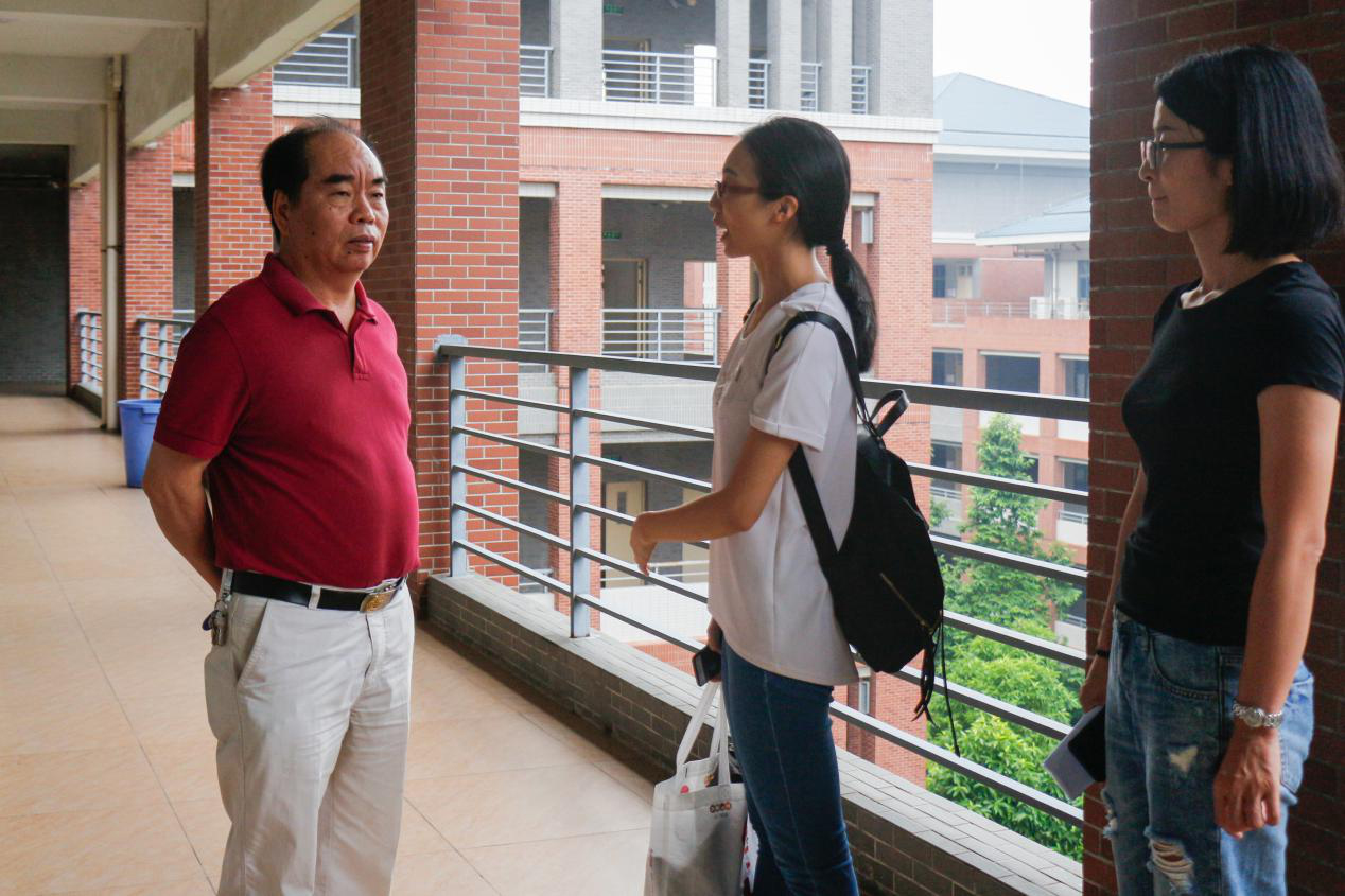 蓝永金副校长、副书记(左一)巡课后与老师交谈