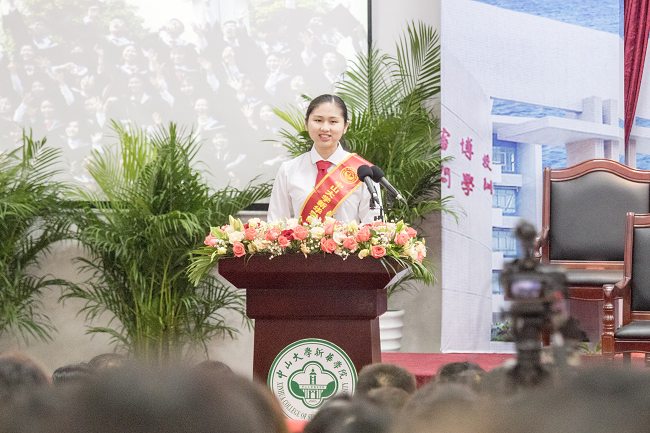 优秀毕业生代表护理学院2014级护理学专业黄晓仪同学在发言中,代表2018届毕业生向每一位曾关心、帮助他们的老师致以衷心的感谢,并向在场的每一位同学表示衷心的祝贺。黄晓仪细数在中大新华度过的美好瞬间,感慨地说:“这些场景像一副副动人的画面,串成一部即将落幕的电影,播放着我们的喜怒哀乐,记录着曾经的青春过往,也见证着彼此的情深义重。”黄晓仪希望即将离开熟悉的校园、各奔前程的毕业生们,不论身在何方,都不要忘记曾经结下的友情,更不要忘记自己心中的梦想。最后,黄晓仪动情地说:“今天,就让时间作证,见证承载着梦想的我们从新华开始起飞吧!让我们更加勇敢、坚强、成熟地面对未来。”
