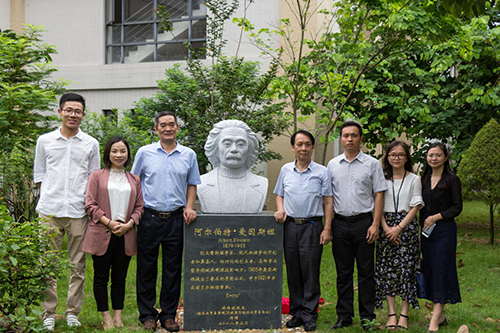 仪式上,捐赠单位代表经济与贸易学院袁持平院长,2012级林世聪校友代表爱因斯坦雕像捐赠者2006级林杨波校友分别发表讲话,王庭槐校长为捐赠单位颁发纪念证书并合影留念。