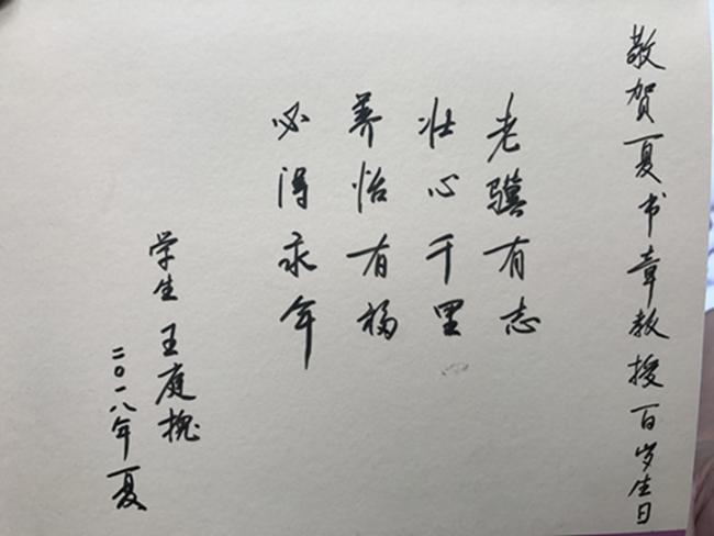 恰逢夏书章教授百岁华诞来临之际,王庭槐校长代表学校祝福夏老:“桃李天下,寿比彭祖。”并为夏老作诗敬贺:“老骥有志,壮心千里;养怡有福,必得永年。”