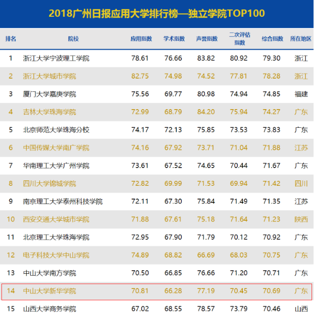 在“2018广州日报应用大学排行榜”(独立学院TOP100)榜单声誉指数排名中中山大学新华学院位居第五位