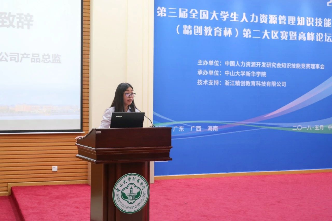 协办单位浙江精创教育科技有限公司产品总监杨燕女士在开幕式上致辞。杨燕女士首先欢迎参赛队伍,对主办方以及志愿者表示感谢。谈及人力资源的重要性,她指出竞赛有利于提高参赛学生理论联系实际的能力,并且能够提高学生主动学习的意识,创新意识,心理素质以及就业素质。