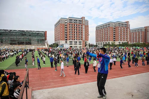 千人共舞-健身操作为本次校运会新增加的特色环节,体育部许振刚主任表示,千人共舞,就是要求全民参与,全员参与。现场的校领导、院系领导、教师代表和我们的体育老师都参与了,此举的意义就在于号召新华师生们参与全民健身。
