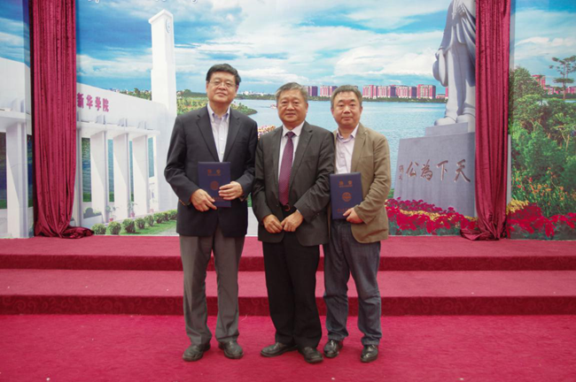 王庭槐校长为王缉思教授(左)、倪峰研究员(右)颁发聘书