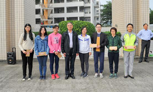 廖振亮副校长为外事处(左一)、学科处(左二)、康复医学系(左三)、继续教育学院(右一)、总务处(右二)、听力与言语科学系(右三右四)的代表队颁发奖金