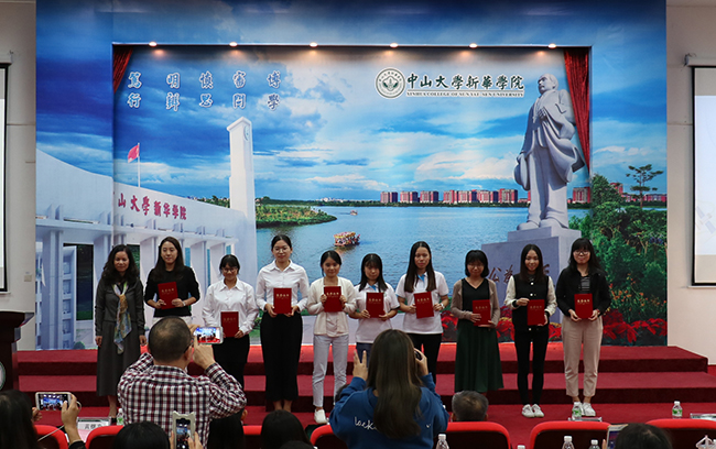 中山大学新华学院外国语学院黄继炎副院长(右一)、李向奇副院长(左一)为三等奖获得者颁奖