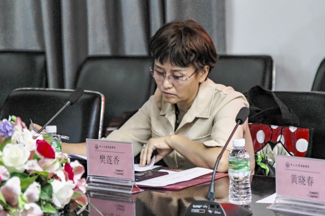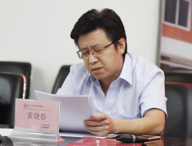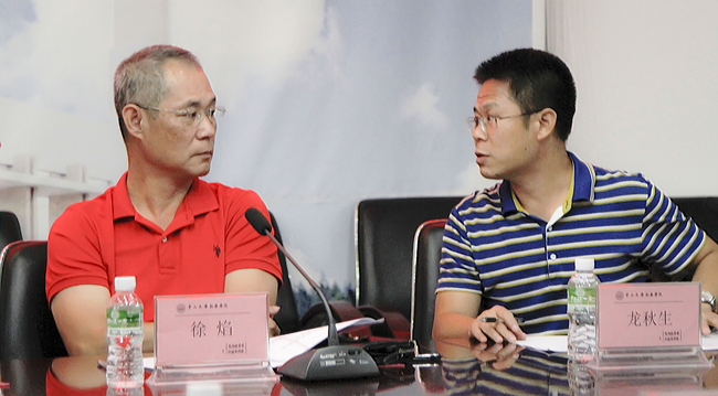 专家组成员广东金融学院主任徐焰教授(左)和广东第二师范学院主任龙秋生教授(右)讨论开题意见