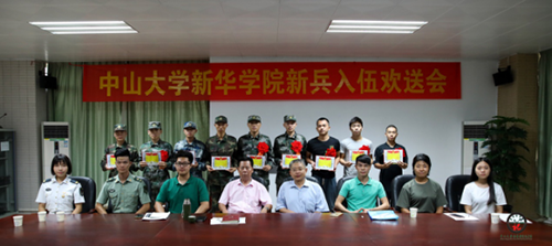 9月9日,中山大学新华学院在东莞校区格物楼2A102会议室召开2017年新兵入伍欢送会。会议由保卫处罗立和副处长主持,保卫处副处长黄志刚、团委副书记代亮、保卫处谢亮老师、柯洽老师和三名退伍学生代表及九名入伍新兵参会。