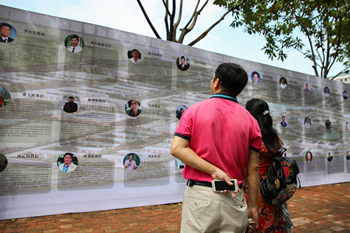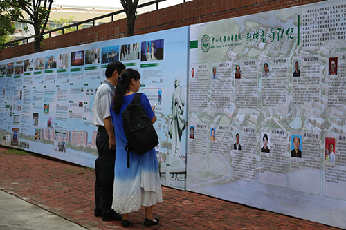 新生家长驻足在院系风采、教学督导风采前了解各专业特色、教学质量