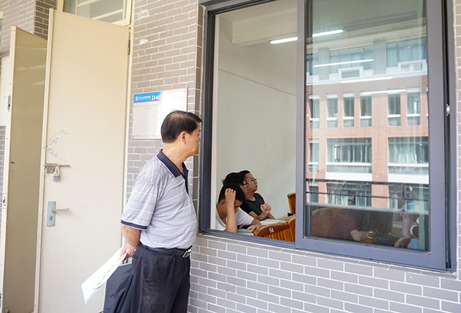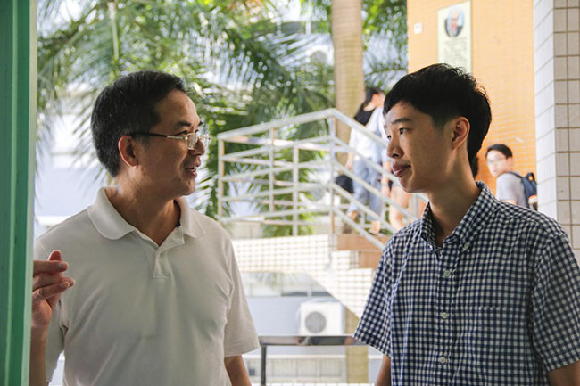 王庭槐校长向提早来课室准备上课的同学了解学习情况 王仲贤 摄