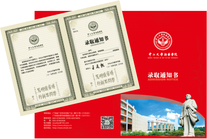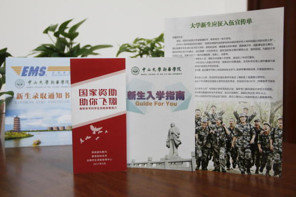 随中山大学新华学院录取通知书一并寄出的信封中,还包含了《致2017级新生的一封信》、《致2017级新生家长的一封信》、中山大学新华学院推荐暑期阅读书目、中山大学新华学院学生意外综合保障保险和广州市城乡居民基本医疗保险政策简介、家校协同育人通联信息表、新生入学指南、新生调查问卷、逸仙新华班材料、征兵材料、高校本专科学生资助政策简介、中山大学新华学院校园网络服务指引、广东省家庭经济困难学生认定分析表等十二份材料。