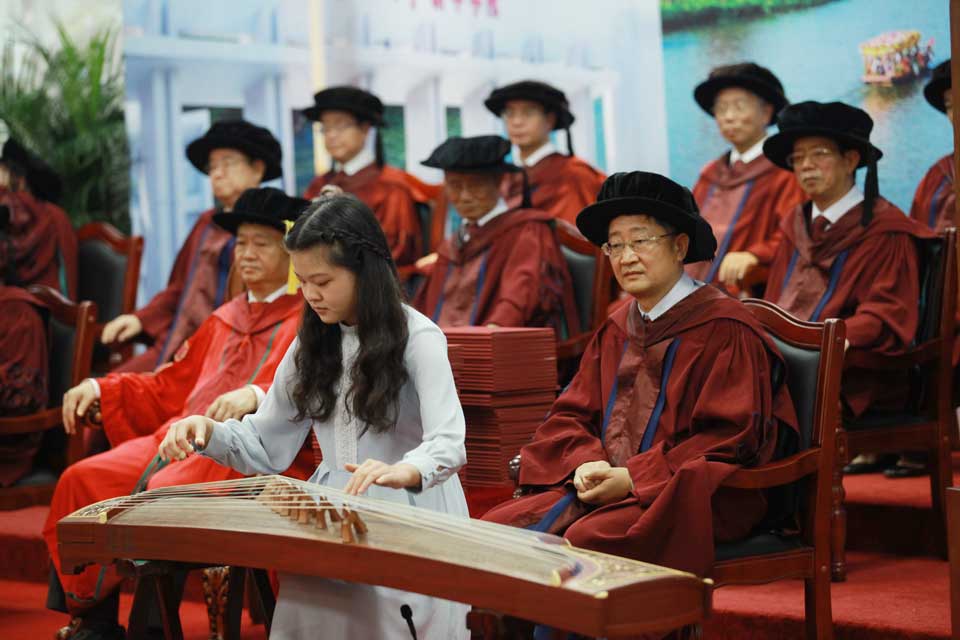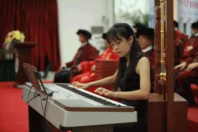 师生代表们在仪式上为即将告别母校的全场毕业生献上精彩演出,为他们的毕业增添喜悦、欢快与不舍,为他们的前程送上美好祝福。外国语学院邱易安教授、谢杭航老师,校长办公室潘麒羽老师,人事处姚槿曦老师,艺术团乐器队的林诗涵、陈海伦、黄康泰、陈玉蓉同学等献上了歌曲《To Mr.》《月亮代表我的心》,京剧《红梅赞》《大登殿》,古筝独奏《花篮瑶》《渔舟唱晚》,钢琴独奏《小情歌》《always with me》《梦中的婚礼》,吉他弹唱《童年》,毕业生代表齐声合唱《感恩的心》等精彩纷呈的节目,寄语毕业生常回家看看,祝愿新华学子鹏程万里。