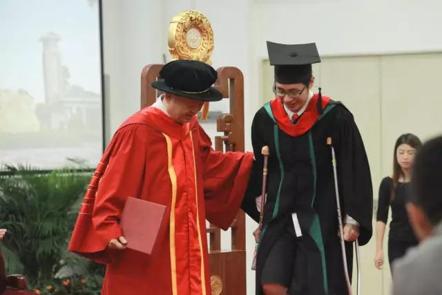王庭槐校长搀扶双臂撑着拐杖前来领取学位证的毕业生