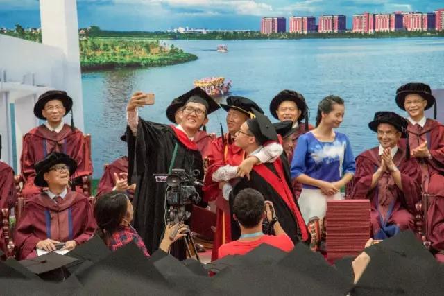 学位授予仪式上,王庭槐校长(中)为4708名获得学位的毕业生颁授学位时学生与校长玩起了自拍