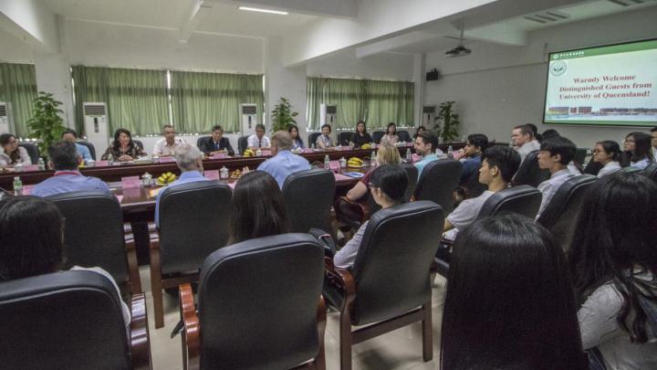 5月29日,澳大利亚昆士兰大学药学院院长、我校药学系首席教授、首届中澳临床药学论坛主席Prof.Peter J. Little AM携首届中澳临床药学论坛代表团一行9位参访我校。我校校长王庭槐、副校长廖振亮、校长助理刘婉莉、校长办公室副主任蔡舒钏、药学系主任陈家树、药学系副主任张素中及药学系师生代表会见来宾。会议由陈家树主任主持。