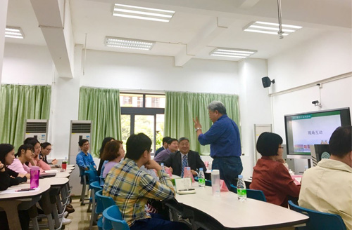 王庭槐和师生热烈欢迎辛致炜的到来,这种“以教会友”的方式很好地加强了海峡两岸的教学互动、理念共享,推进了我校的教学模式改革,为我校“逸仙新华班”教改注入新鲜血液。王庭槐深入解读了“四段式”激越学习法,即:“教师精讲、个体自习、小组学习与实践、成果分享”四个阶段的精髓。