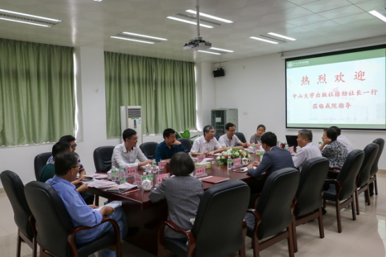 4月18日上午,中山大学出版社徐劲社长、周建华总编、吕肖剑主任、李阳春老师来访我校谈合作。我校校长王庭槐、校长助理林秋贵、教学督导潘敬运、 学科建设与科技发展部部长张玲、信息与网络管理部部长李伟林、校长办公室(党委办公室)副主任兼新闻中心主任蔡舒钏等携有出版计划的教师代表一同会见来宾,双方代表就合作事宜举行会谈。