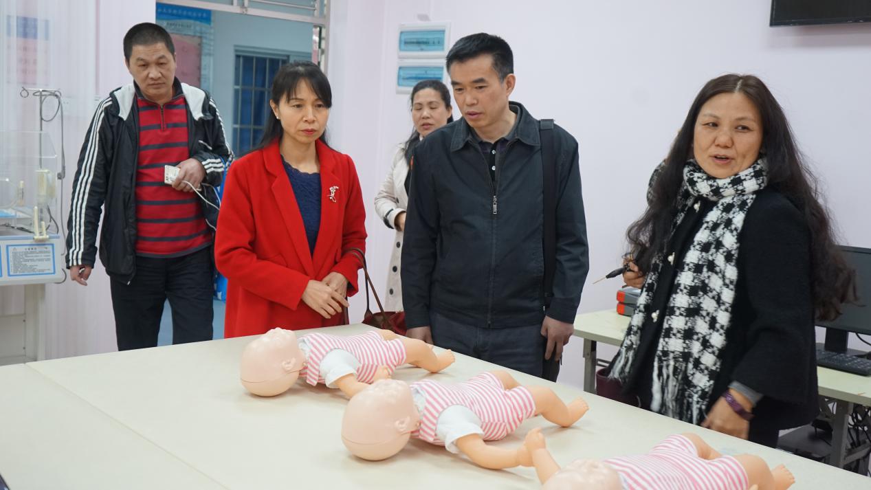 护理学院执行院长王秀岚(右一)等陪同盐医党委副书记左右(右二)一行参观我校护理实验实训中心