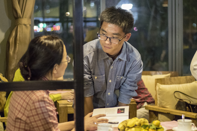 当晚,10位海内外知名作家、诗人、戏剧家、翻译家齐聚我院校内咖啡馆,与中大新华师生代表共同参与了此次风格独特的诗歌盛宴,畅谈诗意人生。中山大学作家写作营创始人戴凡教授与我院外语系英语专业副主任李贻老师共同主持此次湖畔作家朗诵会。