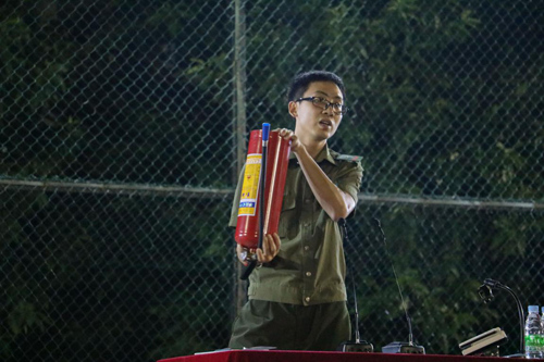 为防范安全事故,切实保护学生的人身安全,麻涌消防大队叶教官从校园安全防范与灭火应急处理等方面向新生普及相关知识,他详细解说了各种逃生技巧,灾情应急方案以及灭火器类型和用法。他强调在宿舍区应做到合理规范地用火用电,在火灾出现时应善用逃生技巧,维护自身的生命安全,将人身安全置于第一位。此外,叶教官现场演示干粉灭火器的用法。
