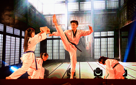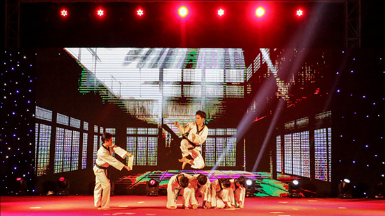 跆拳舞+特技破板表演《舞跆风》。傲气傲笑万重浪,热血热胜红日光,一静一动,自信勇敢,每招每式,虎虎生风。