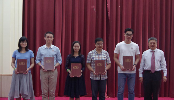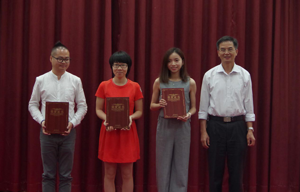 王庭槐院长(右一)为获得经贸系杰出贡献奖的教师颁发荣誉证书
