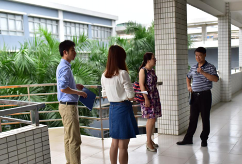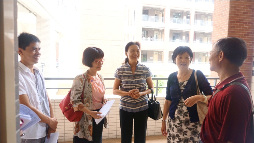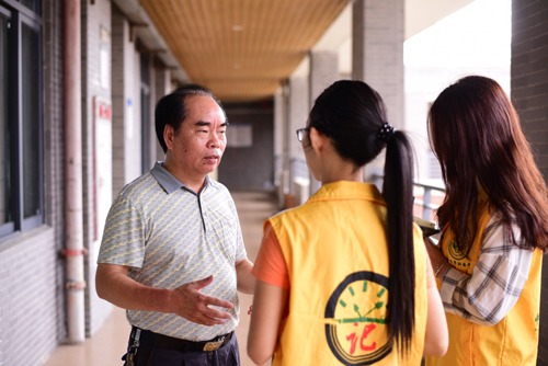 蓝永金副院长、副书记(左一)巡视课堂后与记者交谈