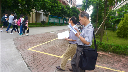 教学督导室主任潘琪教授(左)和教学督导韦沛文教授(右)拿着事先打印好的课表,早早来到教学楼检查新学期教学工作。
