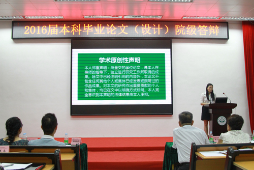 依据学院规定,2016届本科毕业论文(设计)答辩分两阶段进行,各系先组织毕业生参加系内答辩,学院再随机抽查一定比例的学生参加院级答辩。