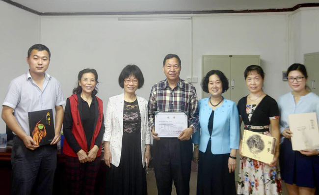 温华文先生(中)与吴素香副主任(左三),钟伟珍馆长(右三)及教师代表合影留念