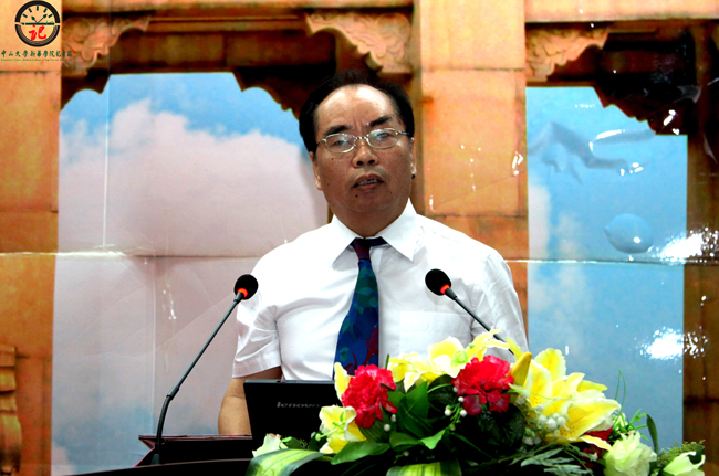 李中生副院长宣布:“中山大学新华学院2014届毕业典礼正式开始!全体起立,奏唱国歌!”随后,在师生的热烈掌声中,我院院长王庭槐作致辞。