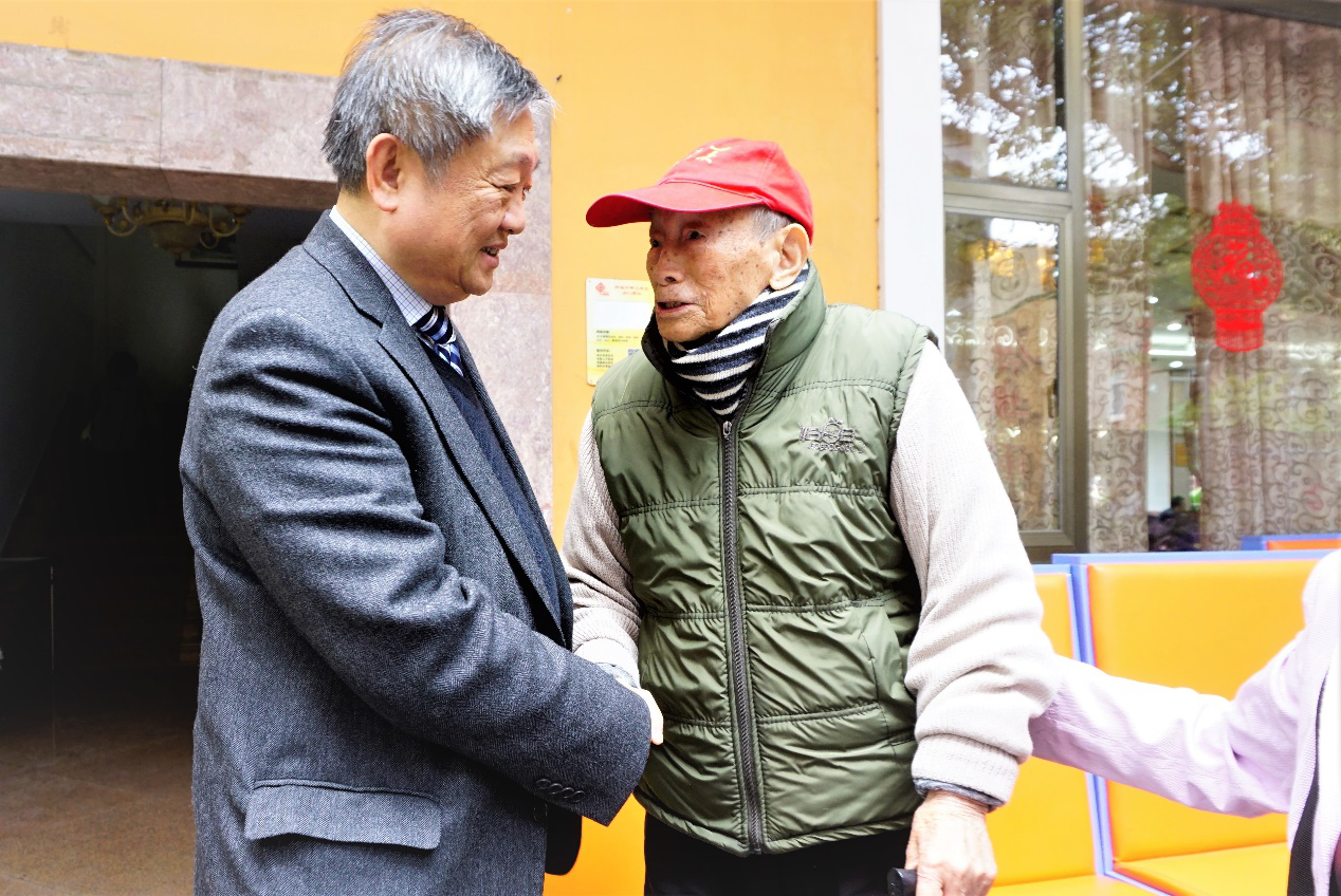 王庭槐校长(左)慰问中山大学百岁老红军姚崇仁副院长(右)