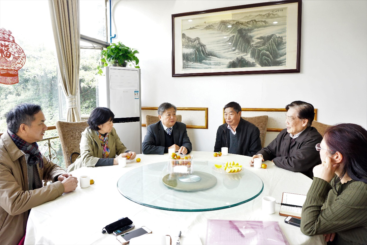 我校领导看望首任党委书记刘美南、首任校长张纯祥并商讨学校建设与发展问题(从左至右:杨卫华、周云、王庭槐、刘美南、张纯祥、丁艮平)