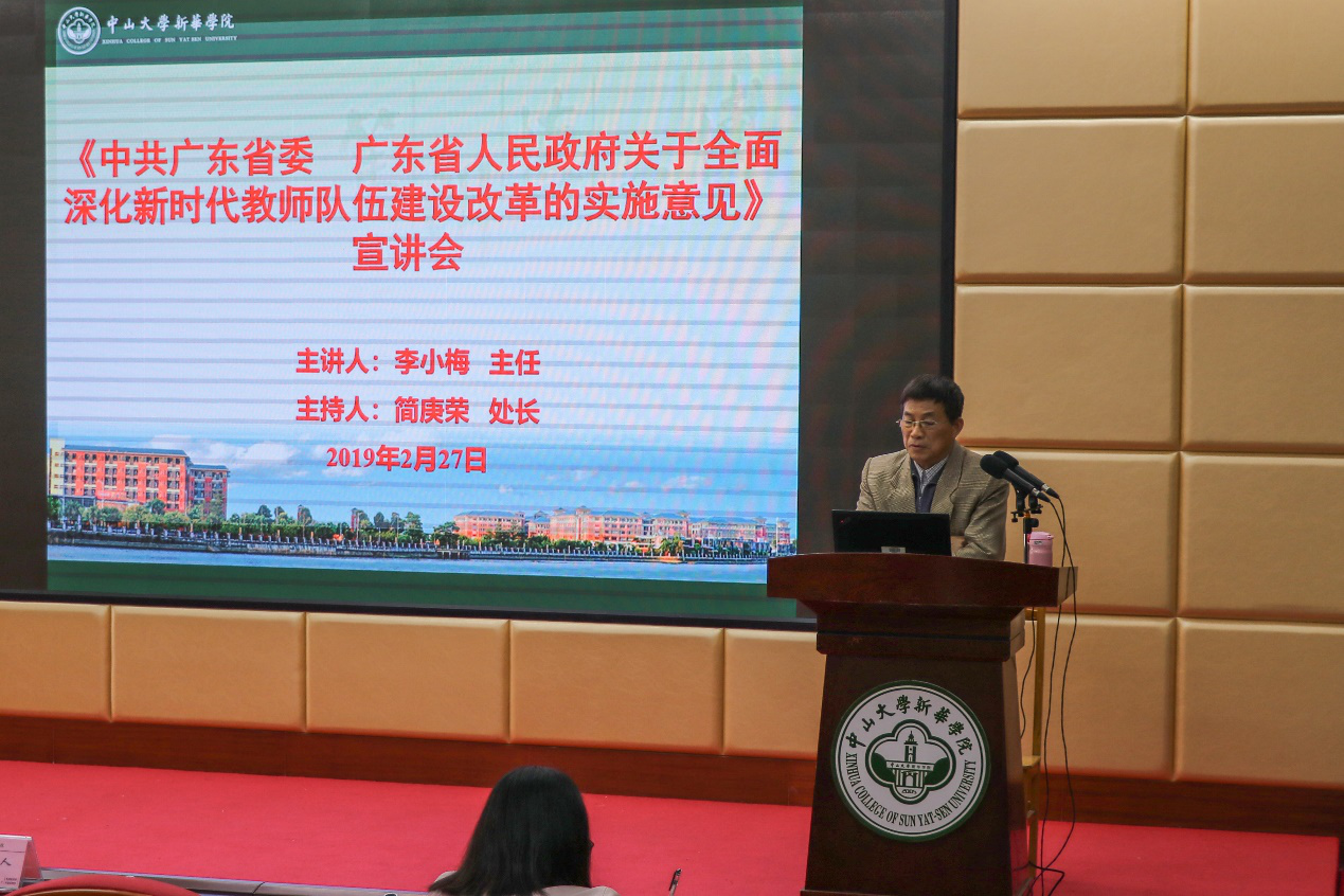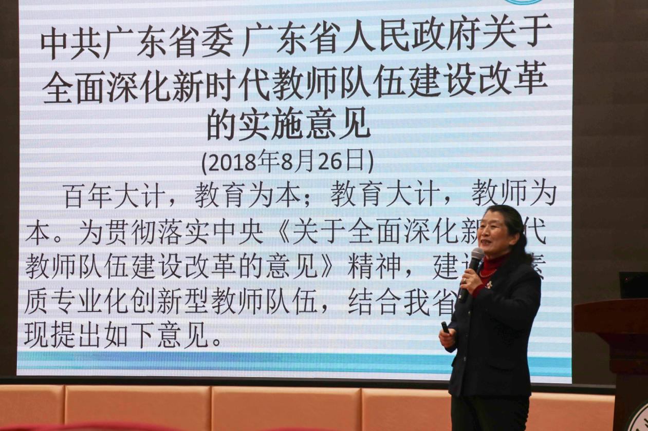 为贯彻落实中共中央、国务院《关于全面深化新时代教师队伍建设改革的意见》精神,建设高素质专业化创新型教师队伍,2月27日和3月5日,我校先后在广州校区D101讲学厅和东莞校区格物楼2-B209教师发展中心录播室举行学校关于《中共广东省委广东省人民政府关于全面深化新时代教师队伍建设改革的实施意见》(以下简称“意见”)的宣讲会,我校教师发展中心主任李小梅担任主讲人,人事处处长简庚荣主持会议,两校区教职工代表近百余人参会学习。
