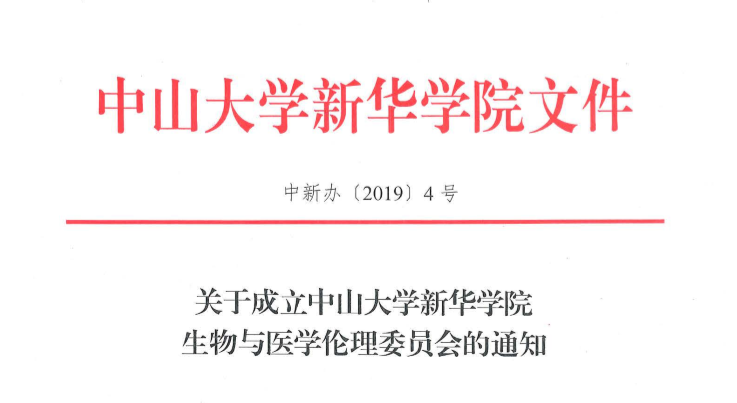 2019年3月5日,学校发文《关于成立中山大学新华学院生物与医学伦理委员会的通知》(中新办〔2019〕4号),正式成立学校生物与医学伦理委员会,并由学校督导、高级顾问陈玉川教授担任主任委员,医学科学技术学科党总支书记、生物医学工程学院院长陈仲本教授任副主任委员;由来自法学院、马克思主义学院、公共治理学院以及学科与科技管理处等多位资深教师任成员。