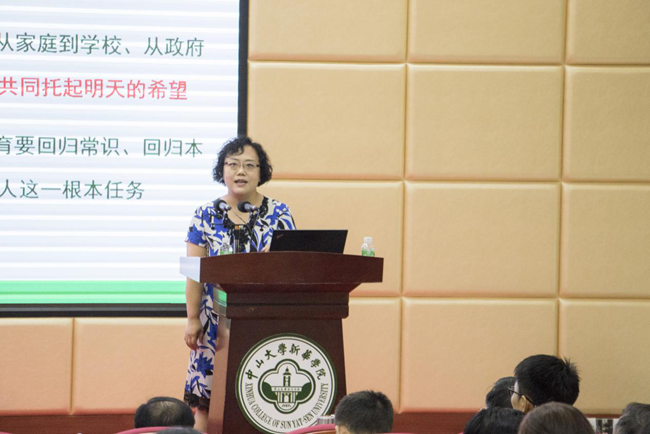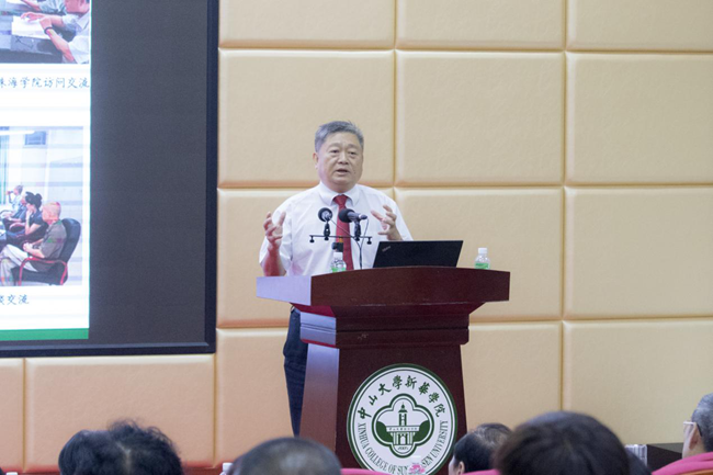 “特色是什么?”王庭槐从“管理学、经济学、医学等专业特色”、“开天窗、接地气的人才培养模式改革”、“人才培养模式改革‘试验田’——逸仙新华班”、“助力粤港澳大湾区创新驱动的Fab Lab创新中心”、“‘互联网+’课程资源:慕课荟萃平台”、“‘学分银行’建设”等方面总结了我校的办学特色并欣慰地提到,在2018广州日报应用大学排行榜(独立学院TOP100),中山大学新华学院位居全国第十四名。其中,逸仙新华班人才培养的特色在于突出专长、突出特性、突出人性修养、突出应用能力,真正做到“德才兼备,知行合一”。“一人一课表”对接专业,采取“2+2”培养模式:第一、二学年单独组班宽口径培养;第三、四学年实行个性化专业培养。“三导师制”联合培养:全程导师、专业导师、特长导师(学校—家庭—社会协同组建)。探索激越“四段式”教学法:对学生,引导学生关联学习、自主学习、探索学习;对教师,带动教学改革、提高教师能力。要在全校范围内总结推广逸仙班经验。Fab Lab创新中心得到广东省教育厅邱克楠副巡视员的肯定。在“互联网+”课程资源方面,我校建设“MOOC荟萃平台”,引入国内外优质在线课程资源420门(尔雅、智慧树、优课联盟和人卫慕课等平台)本学期的选课人数达到20548人次。“学分银行信息管理系统”、“学生自助服务终端”上线,为学生提供自主性、多样化的学习服务,毕业时可拿到学分银行成绩证书和学士学位证书,有“双证”在手,无论是就业还是深造都更有竞争力。