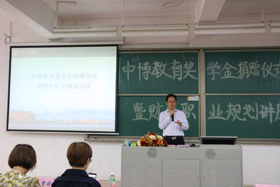4月17日下午,中博教育奖学金捐赠仪式暨财会职业规划讲座在我校东莞校区定静楼②A201举行。我校会计学院院长刘运国教授、党总支书记张丽拉教授、常务副院长林源副教授、财务管理专业副主任熊诗忠、学院办公室主任吴津钰等老师以及2016级学生代表参加本次活动。广州中博教育股份有限公司副总裁师韫、广州中博教育股份有限公司广州分公司总经理原雯婷、CPA讲师臧帅等嘉宾应邀出席仪式。活动由林源副院长主持。