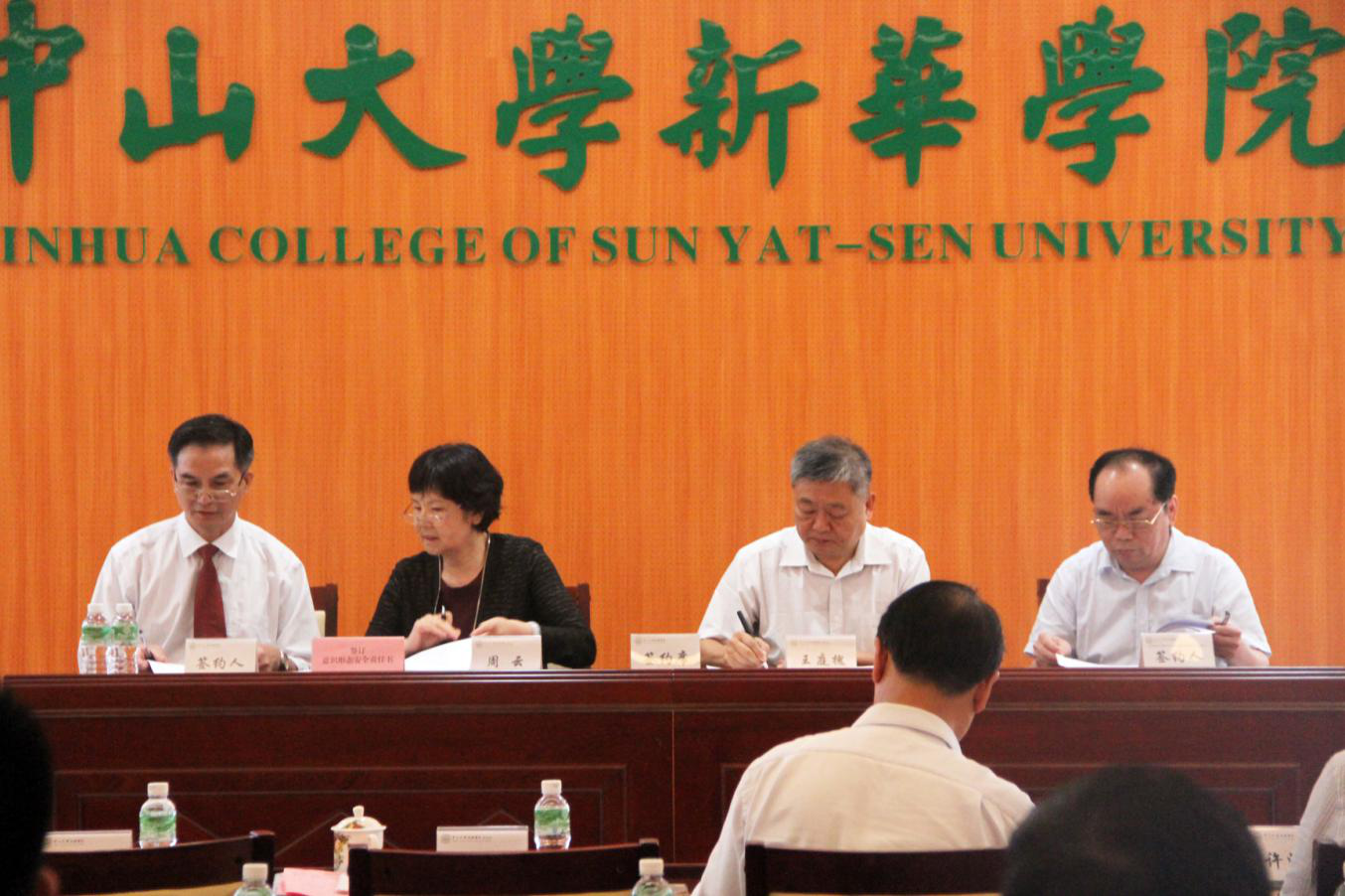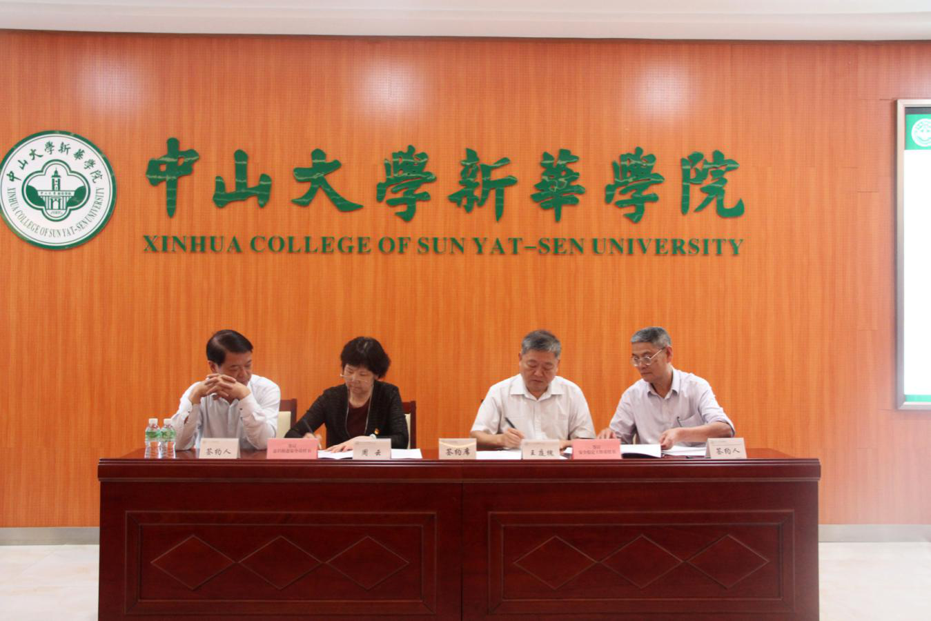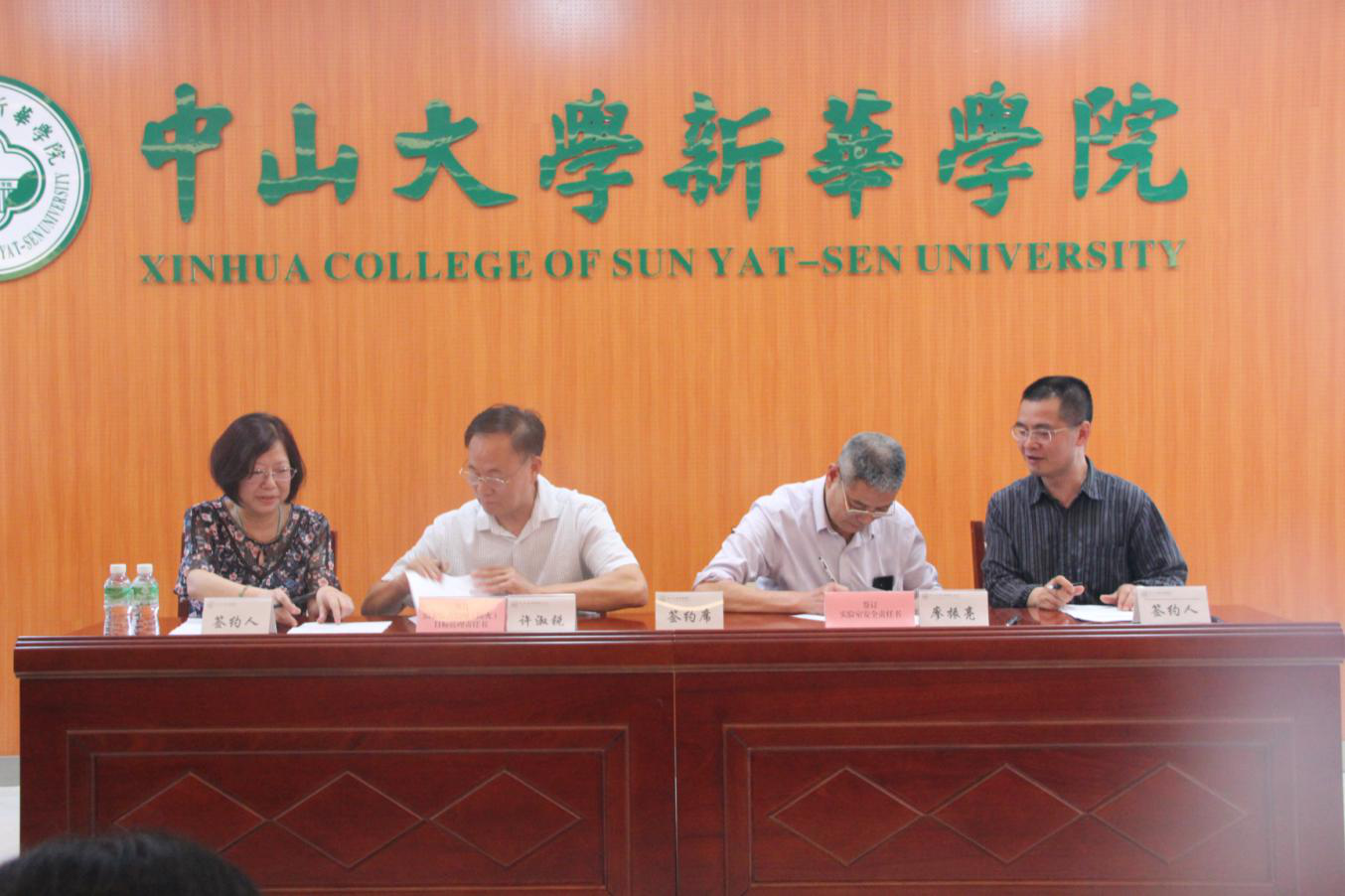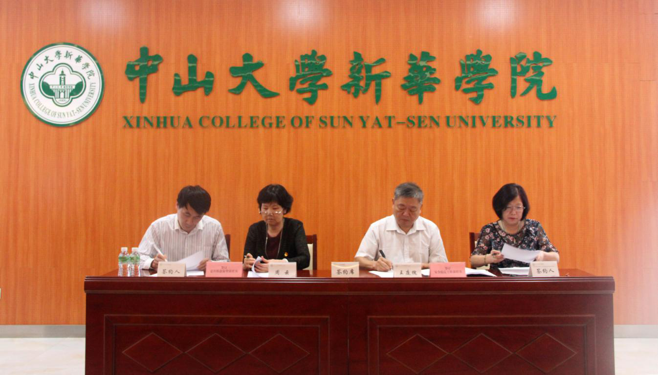 中山大学新华学院2019年维护稳定及治安综合治理(防火)目标管理责任书、实验室安全责任书签字仪式现场 (左起:校长办公室、党委办公室主任、工会主席丁艮平,许淑锐副校长,廖振亮副校长,外国语学院副院长李向奇)