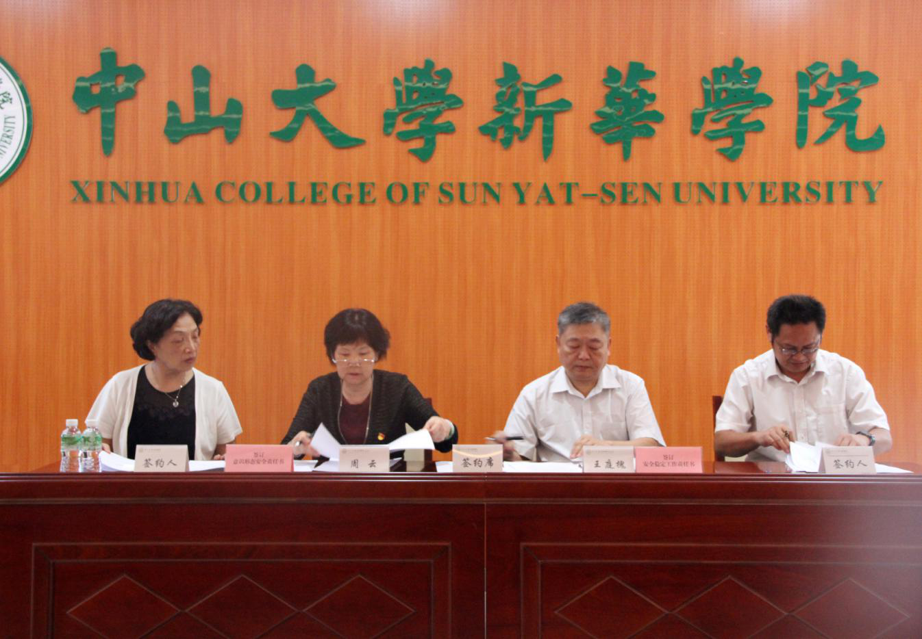 中山大学新华学院2019年安全责任书签字仪式现场 (左起:李中生副校长,周云书记,王庭槐校长、副书记,廖振亮副校长)