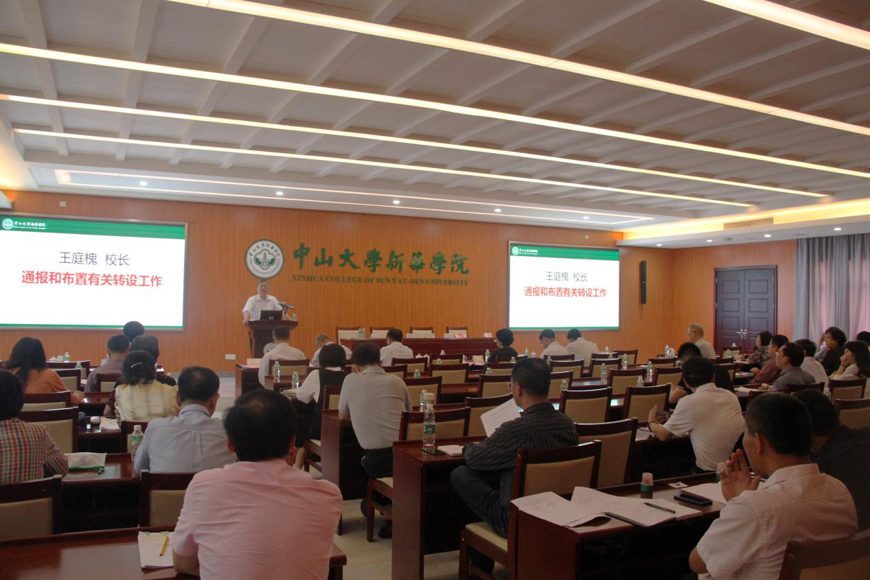 对于转设工作的开展,王庭槐提出几点要求:一是要提高政治站位,领会国家精神,凝聚共识。全校师生要凝聚共识,认识到转设工作与学校发展各项工作的方向是一致的,旨在提升教育质量,培养卓越人才,走出有自身特色的发展道路。二是要加强领导,科学论证,通力合作。转设工作领导小组要进一步加强领导,组织好各单位对标高校设置标准,逐项、逐条、逐点进行梳理,找出差距,积极建设,进一步完善各项办学指标、条件。三是要加强对标建设、自评整改,务求规范。各部门、各院系要对标高校设置标准、本科教学合格评估条件、本科教学工作水平评估各项指标,尤其是师资队伍、教学与科研水平及教学仪器设备、科研、图书资料投入等指标,并结合今年春季工作会议上布置的九项重点工作和各院系的任务清单,严格按照广东省教育厅关于本科教学工作水平评估良好的要求来重抓建设,努力完成各指标任务。四是要以评促建、重在建设,按期保质。进一步“加强规范办学和内涵建设,提质量、上水平、树品牌,着力建设高水平、应用型、有特色的中大新华”。