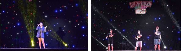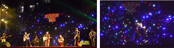 校园歌手叶诗婕琳为大家深情演唱了rolling in the deep,精准的英文咬字、恰到好处的动作表情以及专业的演唱水准,让现场的观众感受到黑夜中无尽的音乐魅力。rhythm boom 组合表演的b-box说唱节奏感十足,Hip Hop元素令整个足球场的同学们热血沸腾。实验飞行家乐队弹唱的《花房姑娘》则带着浓郁而温暖的摇滚风,驱走蒙蒙秋雨所带来的凉意。武术协会所带来的激昂大气的武术表演《自强不息》,以满满的正能量更是将全场的气氛推向了高潮。观众们挥舞着的荧光棒与舞台灯光相呼应,整个足球场变得色彩斑斓,异常浪漫。