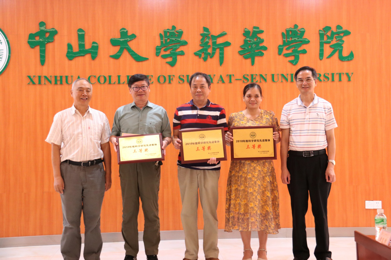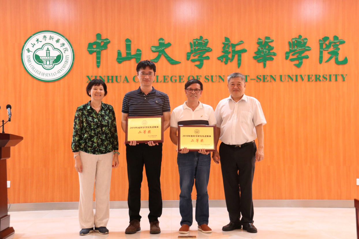校长王庭槐教授、校党委书记周云研究员、副校长杨卫华教授和校督导室主任陈汝筑教授对荣获中山大学新华学院2018年度科学研究先进集体一等奖信息科学学院;二等奖康复医学系、生物医学工程学院;三等奖医学公共课教学研究部、药学院、公共治理学院共6个二级教学单位分别进行了表彰并颁发奖牌和奖金。