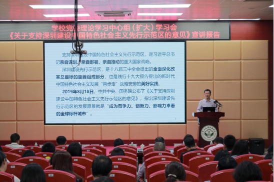 为深入学习贯彻习近平新时代中国特色社会主义思想和十九大精神,全面推进“不忘初心、牢记使命”主题教育全覆盖、在真抓实干中走深走实,教育引导广大师生党员干部群众主动谋划、积极融入粤港澳大湾区规划建设和深圳建设先行示范区的时代使命与伟大愿景中,我校党委于10月16日在广州、东莞两校区同步召开了学校党委理论学习中心组(扩大)学习会——《中共中央国务院关于支持深圳建设中国特色社会主义先行示范区的意见》(以下简称《意见》)宣讲报告,特邀中山大学自贸区综合研究院副院长、粤港澳发展研究院博士生导师、一带一路与粤港澳国际合作研究中心主任毛艳华教授莅临我校,结合《意见》为广大师生作了“深圳建设先行示范区的使命与愿景”专题辅导报告。该报告是我校党委邀请校外专家学者主讲“不忘初心、牢记使命”主题教育系列专题党课的重要一环。我校党委书记周云研究员主持会议。