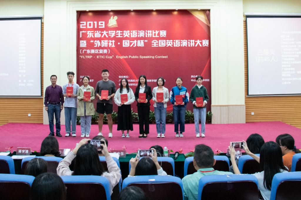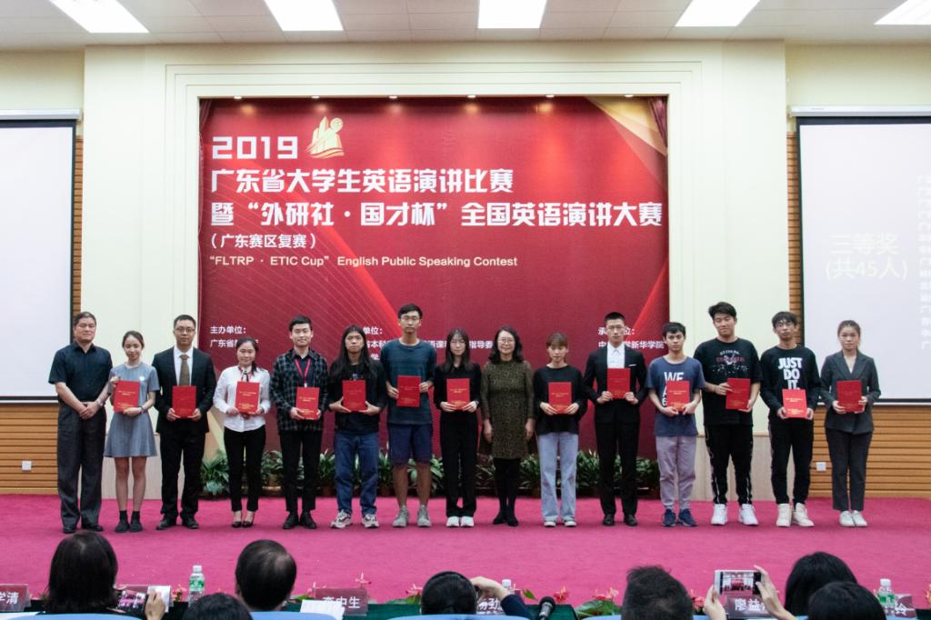 比赛历时两天,分为半决赛和决赛。经过激烈角逐,来自华南理工大学的谢颖昕、深圳大学的彭梓洲、华南农业大学的徐懿情3名菁英选手脱颖而出,获特等奖,并将于12月代表广东省登上“外研社·国才杯”全国英语演讲大赛北京总决赛舞台,一展新时代大学生风采。